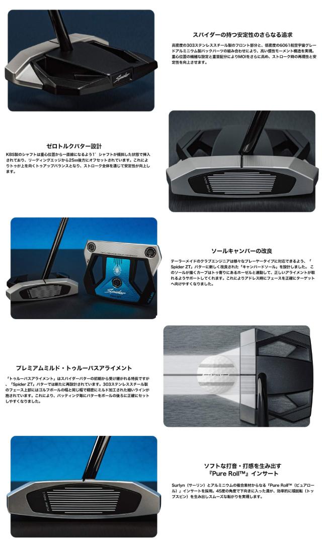 ゼロトルク、解禁。「SPIDER ZT」パター迷いもズレもゼロになる。フラッグシップモデルとも言える「Spider」で培われた性能を受け継ぎながらも、さらに進化したゼロトルク設計の「Spider ZT」パター。高慣性モーメントでこれまでに無い安定性とグリーン上での一貫したパフォーマンスを実現します。
