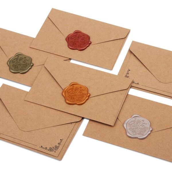 【商品仕様】茶色封筒(計12枚):10.57cm 茶色ミニメッセージカード(計12枚):6.59.5cm 4色シーリングワックス シール(計12枚):3cm 合計36点、12枚セット