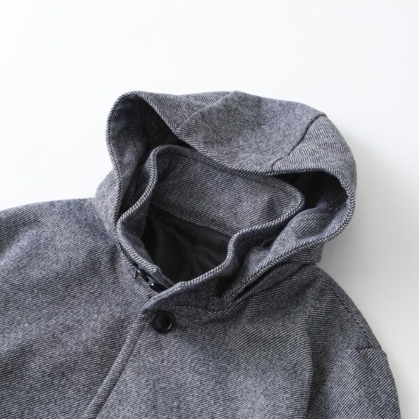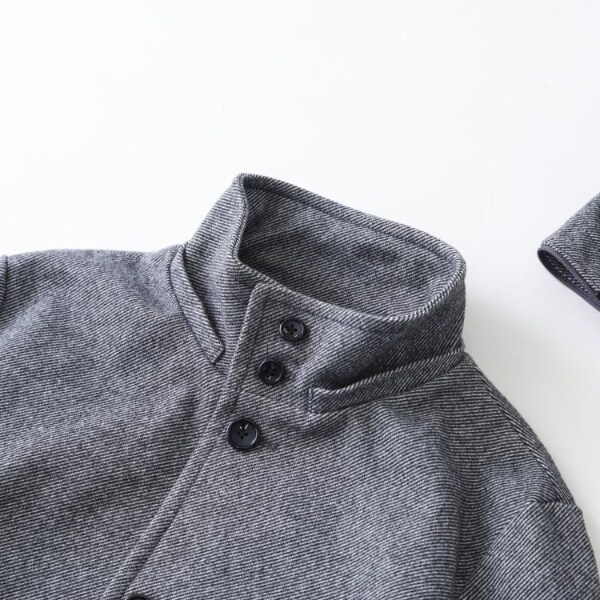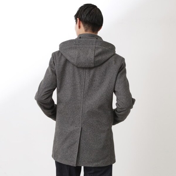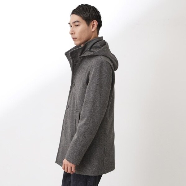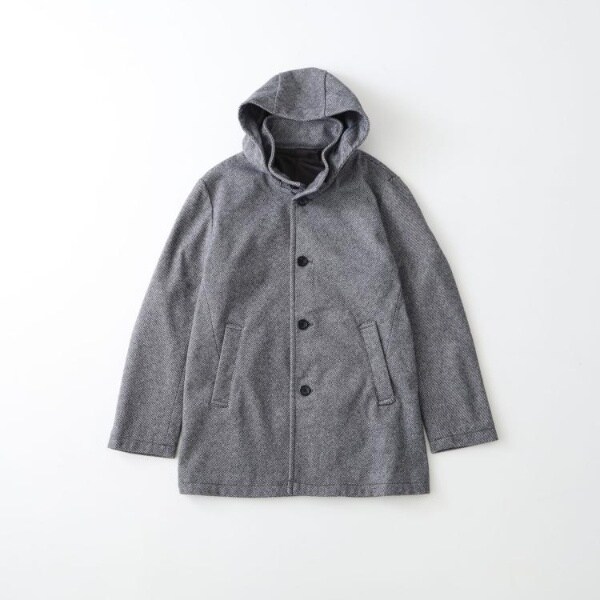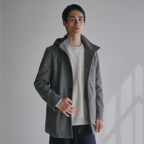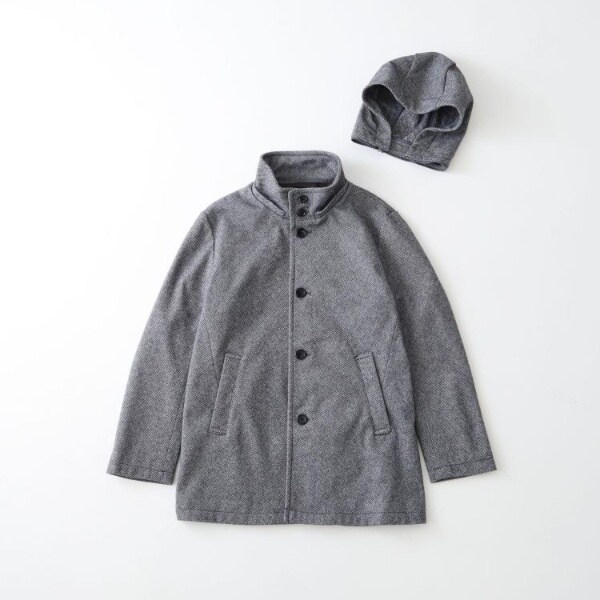 洗えるメルトン素材を使用した、オンオフ兼用のスタンドカラーフードジャケット。