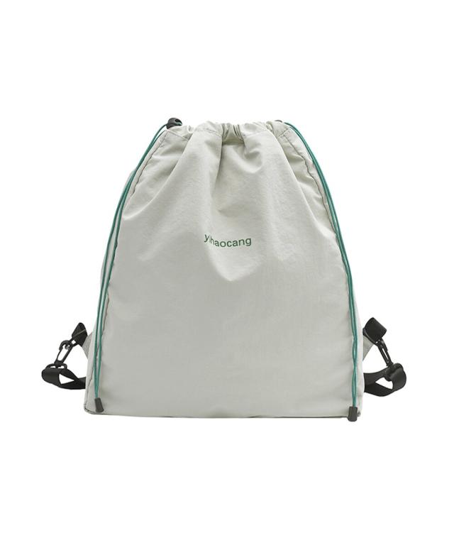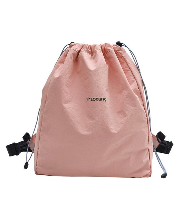 紐を引くだけでキュッと閉じる、コンパクトにまとまる巾着タイプのナップサック。