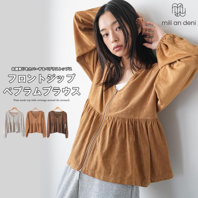春新作 スウェードフロントジップペプラムブラウス トップス 春夏 アウター ジップアップ ノーカラー 長袖 M レディース ミリアンデニ メール便(郵2)対応 a250529
