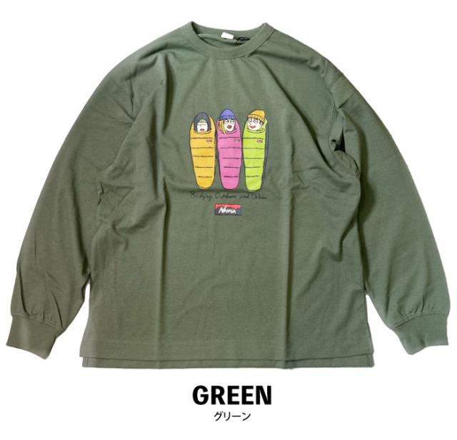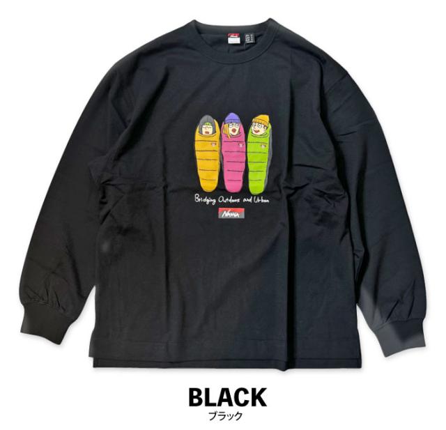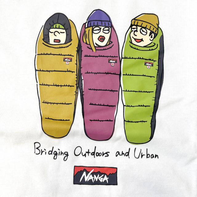 ナンガの寝袋に入って語らう三人組を描いた、遊び心あふれるロンTeeが登場!