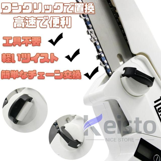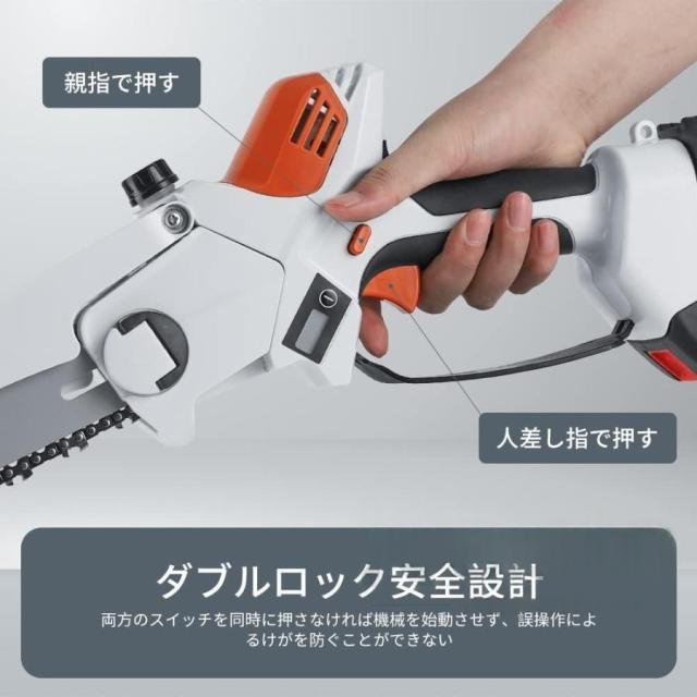【ダブルロックで誤操作防止】 ダブルロックで誤操作防止のシステムがついており、ロックオフボタンを押してからスイッチを押すことによってチェーンソーを作動します。また、FEIJIEチェーンソーは保護バッフルを搭載していて、木片や破片が飛び散るを防ぎます。LED光源を搭載し、暗い場所での安全な作業を守ります。