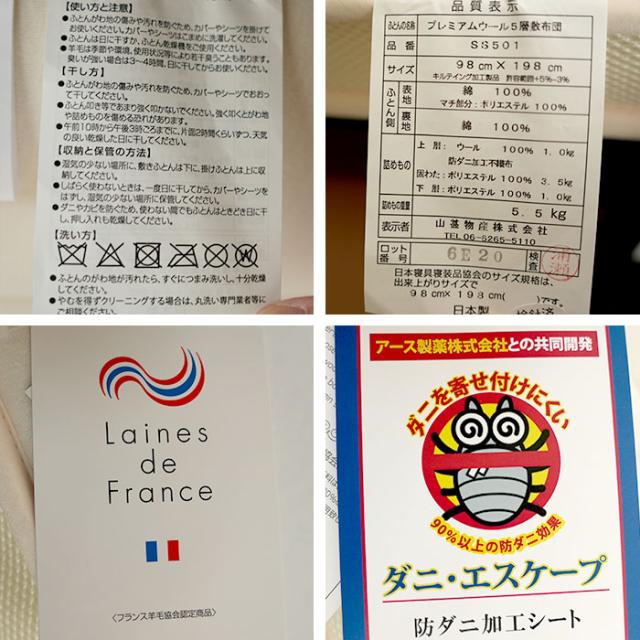 側生地:表:綿100%、裏:綿100% 中綿:(上層部)ウール100%(ラ・クーン種)、シングル1.0kg、ダブル1.4kg。 アース製薬防ダニ不織布入り。 中芯:(上部)ポリエステル固綿(15mm厚)シングル1.0kg、ダブル1.4kg。 (下部)ポリエステル固綿(50mm厚)シングル2.5kg、ダブル3.5kg。 中綿:(下層部)ポリエステル100%。シングル1.0kg、ダブル1.4kg。 詰物重量:シングル5.5kg、ダブル7.7kg。 |