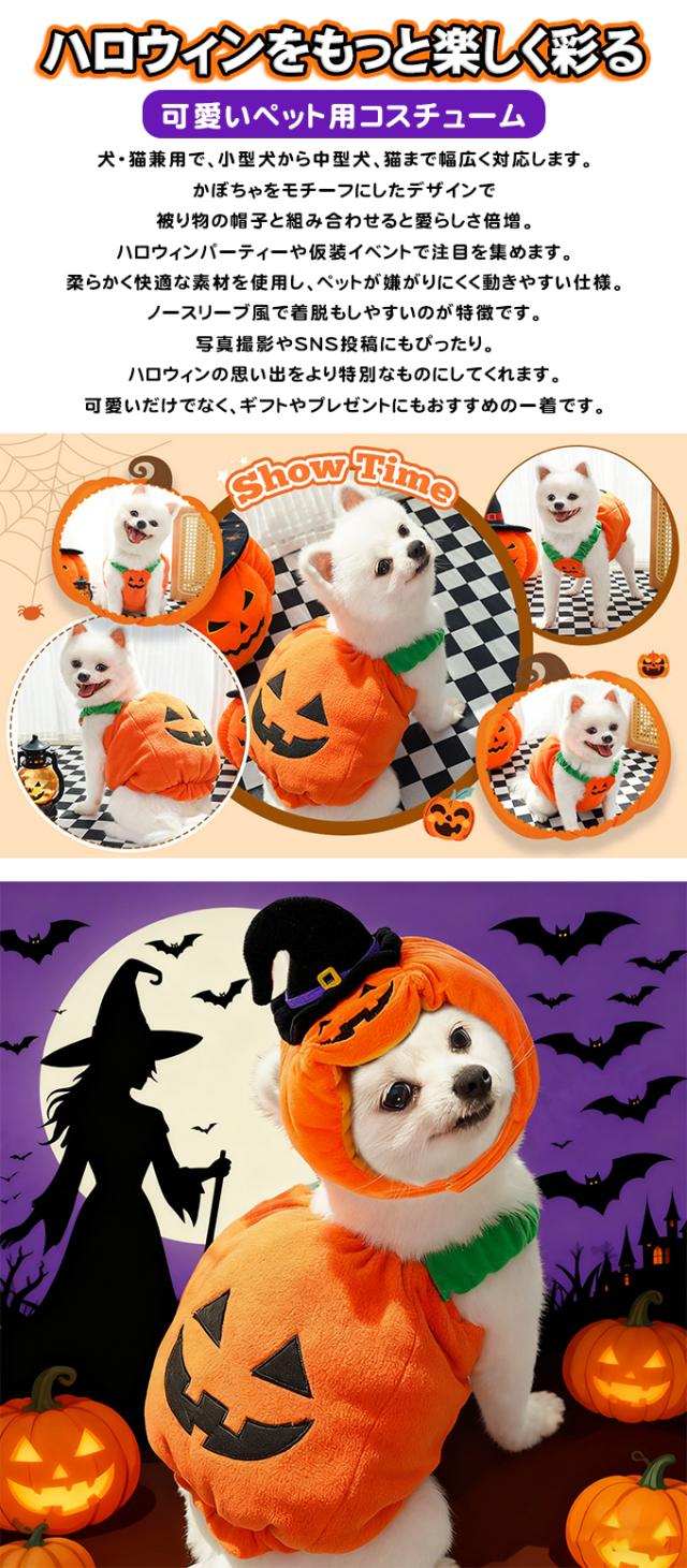 ハロウィンをもっと楽しく彩る、可愛いペット用コスチューム 犬・猫兼用で、小型犬から中型犬、猫まで幅広く対応します。 かぼちゃをモチーフにしたデザインで、被り物の帽子と組み合わせると愛らしさ倍増。 ハロウィンパーティーや仮装イベントで注目を集めます。 柔らかく快適な素材を使用し、ペットが嫌がりにくく動きやすい仕様。ノースリーブ風で着脱もしやすいのが特徴です。 写真撮影やSNS投稿にもぴったり。ハロウィンの思い出をより特別なものにしてくれます。 可愛いだけでなく、ギフトやプレゼントにもおすすめの一着です。 ※モニター環境により多少色合いが異なりますので、予めご了承くださいませ。 |