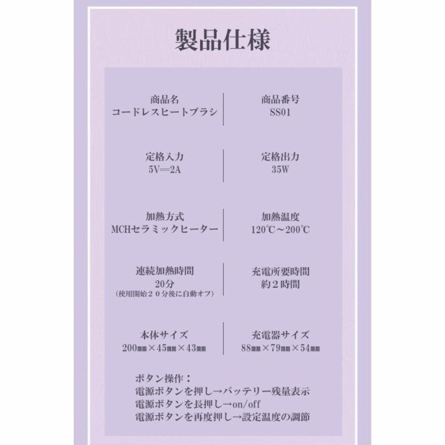 髪質:全髪質 電源:バッテリー式 定格入力:5V=2A定格出力:35W