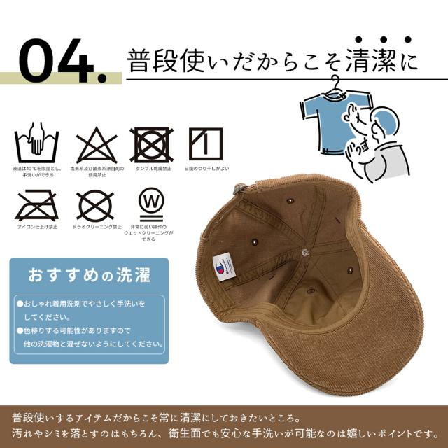 | アイテム | 「深め×大きめ」で、秋冬のコーデに安心感とこなれ感を。 Championのコーデュロイキャップで、顔まわりをもっとおしゃれに。 ちょっと肌寒くなってくる季節。ニットやスウェットを着るように、帽子も“秋仕様”に衣替えしませんか? このChampion(チャンピオン)のキャップは、そんな秋の気分にぴったりの綿100%コーデュロイ素材。 ふっくらとした風合いと、しっかりとした厚みが心地よく、被るだけで季節感がぐっと高まります。 そして、なんといっても魅力は【深め&大きめ】の絶妙なサイズ感。 頭周りは約58?60cmに対応し、「普通のキャップだと浅くて落ち着かない」「髪を結んだ状態で被れない」 そんな悩みを持つ方にもしっかりフィット。頭を包み込むような安心感で、長時間の着用もストレスフリーです。 また、秋も実は紫外線が多い季節。しっかりと長さのあるツバ(約7.5cm)で、 目元や頬を自然にカバー。紫外線対策×小顔見せの効果も抜かりなく、機能性にも優れたアイテムです。 デザインはChampionらしいシンプルで飽きのこない仕上がり。 カジュアルなデニムコーデや、トレンドのスウェットスタイルはもちろん、 ベージュカラーなら柔らかく上品に、ブラックならぐっと引き締まった印象に。 どんな装いにも自然になじみ、男女問わずユニセックスで楽しめるのも嬉しいポイント。 秋冬のちょっとしたお出かけや、公園へのお散歩、旅行やキャンプなどのレジャーシーンにも。 もちろん、デイリー使いとして毎日のコーデに気軽にプラスできます。 Championの確かな品質と、シンプルながら頼れるデザイン。 “帽子迷子”だった方にも、ぜひ一度試していただきたいキャップです。 |