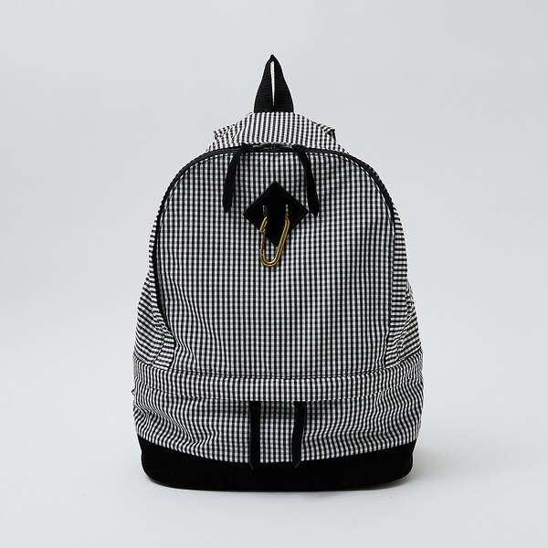 少し長めにとったストラップを調整し、タウン仕様に背負える真鍮のカラビナ付きデイパック。