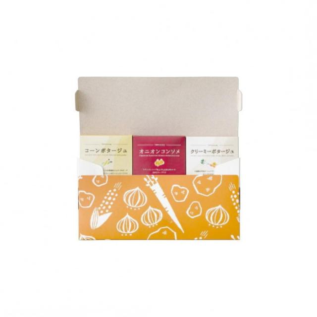 | スイートコーンを使用したコーンポタージュ、チキンコンソメ入りのオニオンコンソメ、北海道ミルク入りのクリーミーポタージュの詰合せ。 |