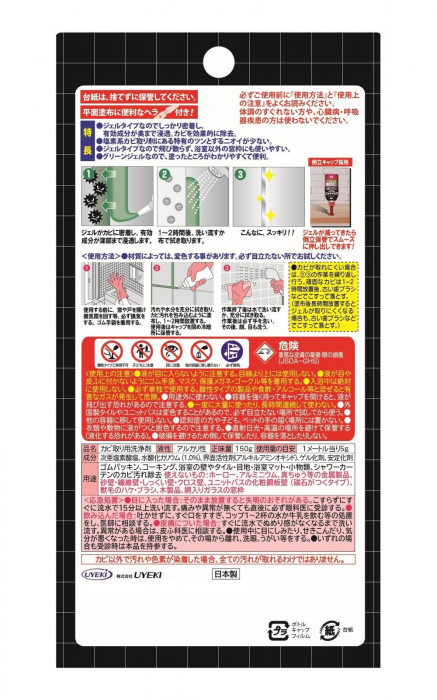 | 仕様 | 成分:次亜塩素酸塩、水酸化カリウム(1.0%)、界面活性剤(アルキルアミンオキシド)ゲル化剤、安定化剤 液性:アルカリ性 使用量の目安:1メートルあたり5g 用途:ゴムパッキン、コーキング、浴室の壁やタイル・メジ・浴室マット・小物類・シャワーカーテンのカビ汚れ除去 使えないもの:ホーロー、アルミニウム、真ちゅう等の金属製品、砂壁・繊維壁・しっくい壁・クロス壁、ユニットバスの化粧銅板壁(磁石がつくタイプ)、獣毛のハケ・ブラシ、木製品、網入りガラスの窓枠 |