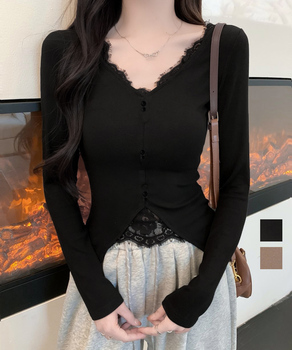 トップス Vネック セクシー 細見えTシャツ カジュアル 風 インナートップス 大人可愛い プルオーバー キレイめ服無地重ね着Tシャツ レース付きトップス 秋冬タイトトップス