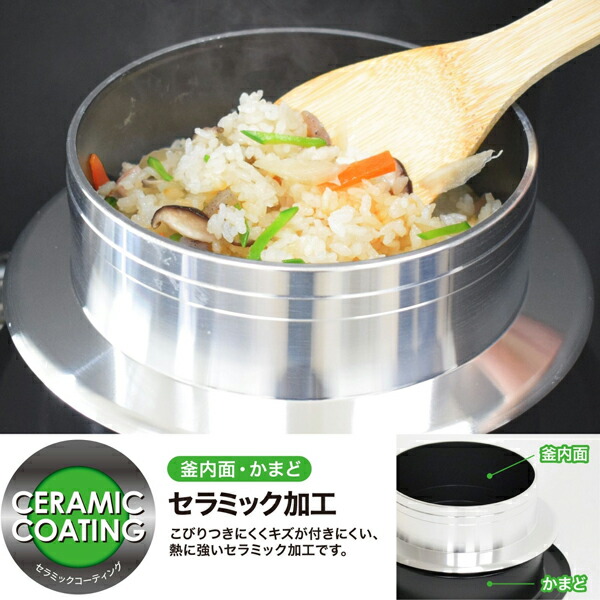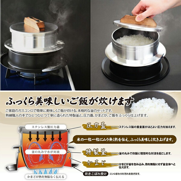 ご家庭のガスコンロで簡単に美味しくご飯が炊ける、本格的な釜のセットです。