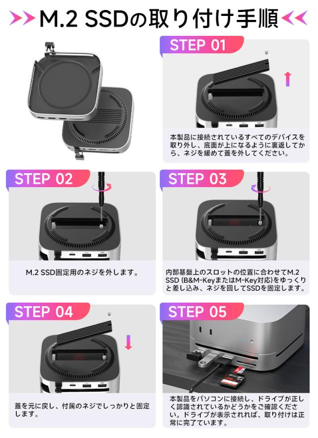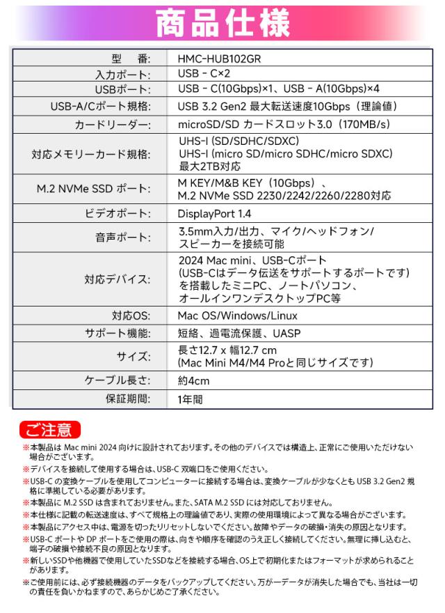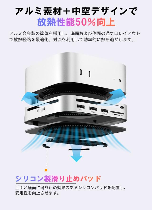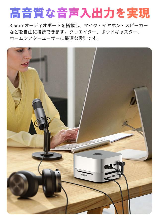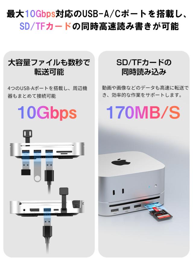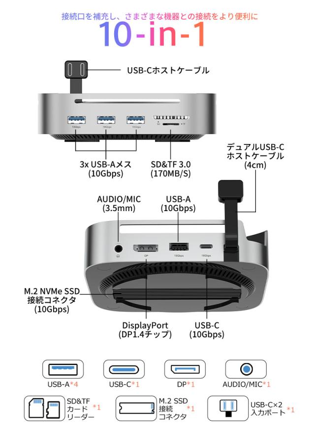 10in1全能型 Mac mini M4/M4 Pro用 USBハブ&スタンド 10Gbps SD/TFカードリーダー USB-A/C DP1.4 3.5mm Audio&Mic M.2 NVMe SSD 8TB拡張 宅配便配送 ポイント消化