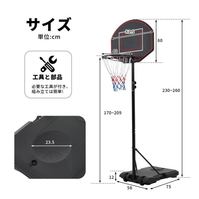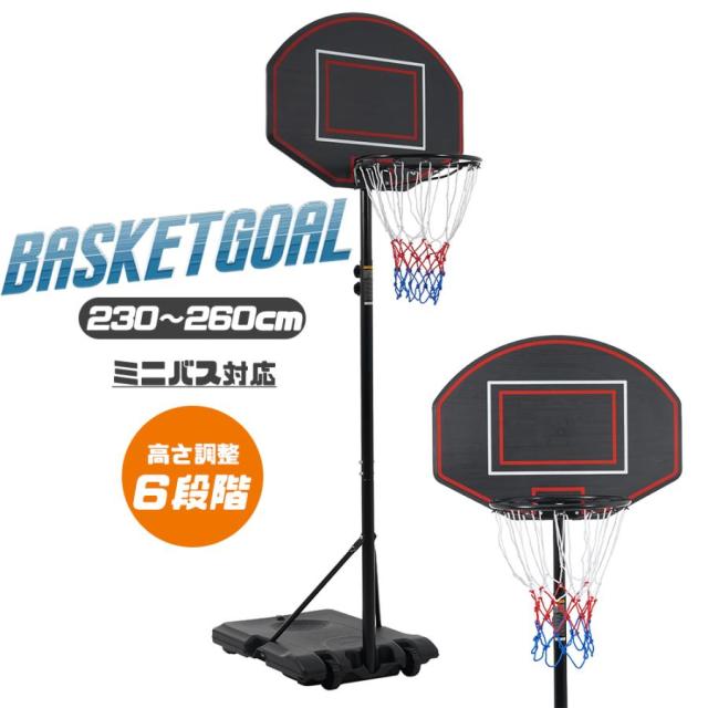 「クーポン配布中」バスケットゴール 高さ6段階調節 179-260cm 屋外 家庭用 高さ調節簡単 移動式 自立式 バスケットボール 安定性高い 室外 バスケットボール 安定性高い 組み立て簡単 大人 子供 こども用 ミニバス 練習用 工具付き キャスター付き