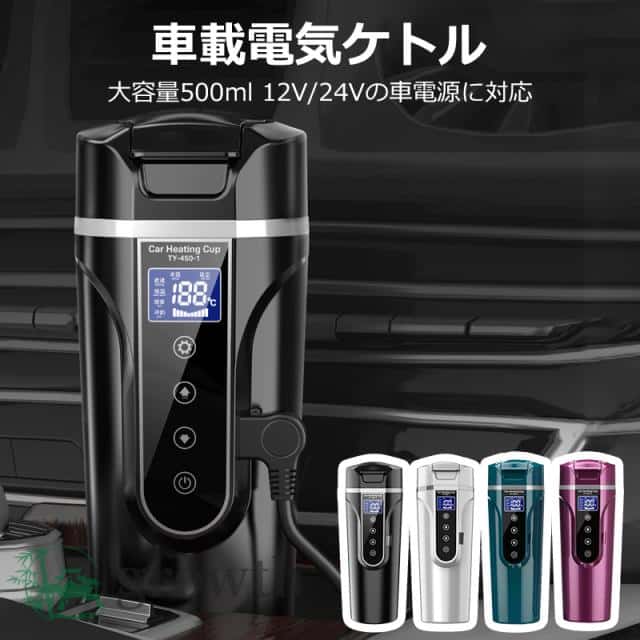 車 電気ケトル 保温機能付き 40℃〜100℃ 500ml大容量 カー用&トラック用DC12V/24V 加熱 保温 湯沸し器 湯沸かし 湯ボルト ポータブルケトル ミニ 電気ポット 車中泊 LCDディスプレイ 沸騰/断熱/お茶作り/ブリューミルク