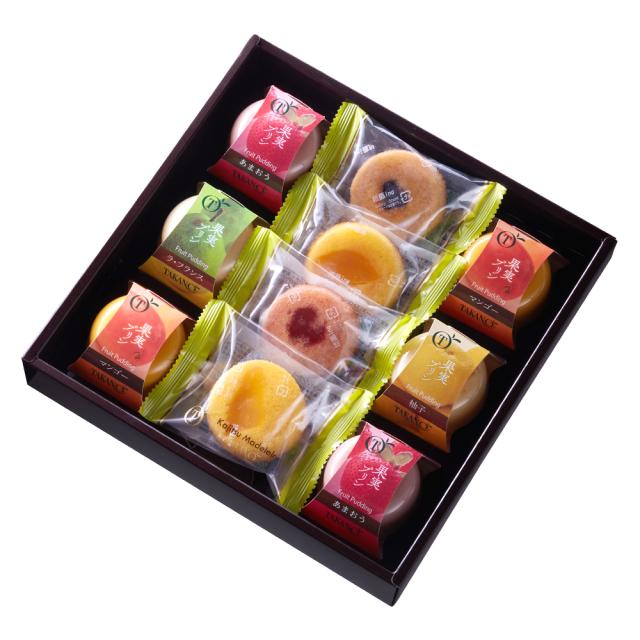 | 内容量 | 果実プリン(あまおう、マンゴー×各2、ラ・フランス、柚子×各1)、果実マドレーヌ(マンゴー×2、ストロベリー、ブルーベリー×各1) |