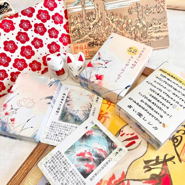 日本白きつね様の52カレンダールノルマン Japanese White Foxs 52nd Calendar Lenormand / 占い カード タロット オラクル スピリチュアル 蓮華 コーヒーカード インド 印刷物 ステッカー ポストカード ポスター