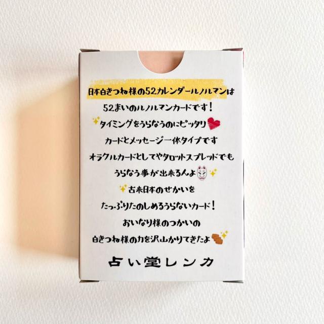「日本白きつね」をモチーフにした52枚のルノルマンカード「ルノルマン・カード」とは、フランス革命からその後の時代、皇帝ナポレオンの隆盛を予言し、政治家や要人たちの未来を驚くほど正確に言い当てたと言われる、パリで大活躍した伝説の占い師、マドモアゼル・ルノルマンの名前を冠した占いカードです。この『日本白きつね様の52カレンダールノルマン』は、「日本白きつね」をモチーフにした52枚のルノルマンカードです。