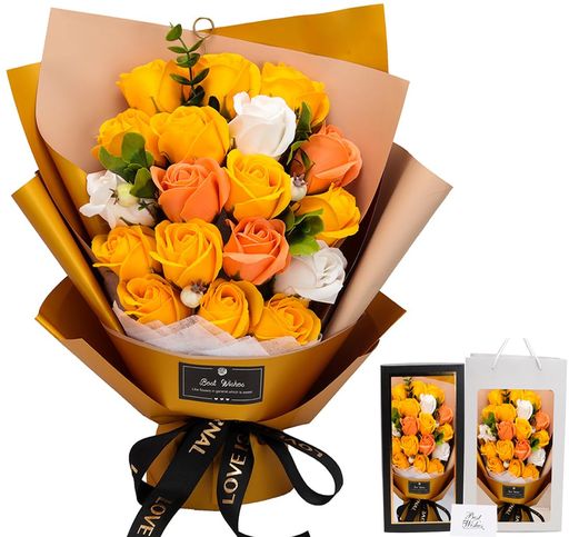 ?【大人気なソープフラワー 】:ソープフラワーは花びら一枚一枚が香りのよい石鹸からつくられた、ほのかに香る観賞用のお花です。生花と違って水やりの必要もなく枯れることがありません。ブリザードフラワーとも違ってほのかな香りを楽しめます。花粉等も無いためアレルギーの原因となることもありません。アイディアに満ち溢れ、柔らかな質感、鮮やかな色合いと雰囲気を長い間お楽しみいただけ、彼女、奥様、母の日のプレゼント、誕生日プレゼント、結婚祝い、卒業式など様々なシチュエーションにピッタリです! 感謝やお祝いの事の贈り物として目を引くおしゃれグッズです。