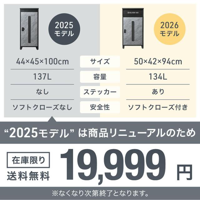 ![]() 105L 専用キー付き | ![]() 大容量137L 安心ゼロリターン錠 | ![]() ポスト一体型 安心ゼロリターン錠 |