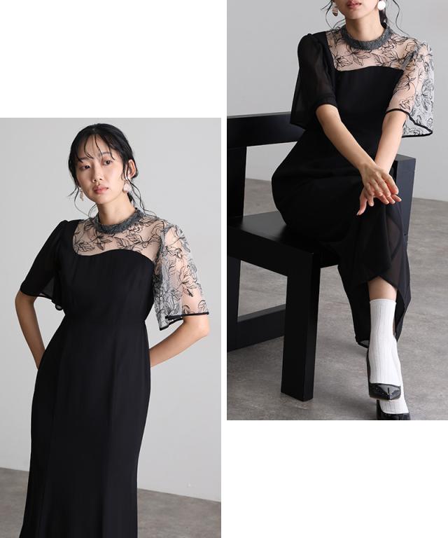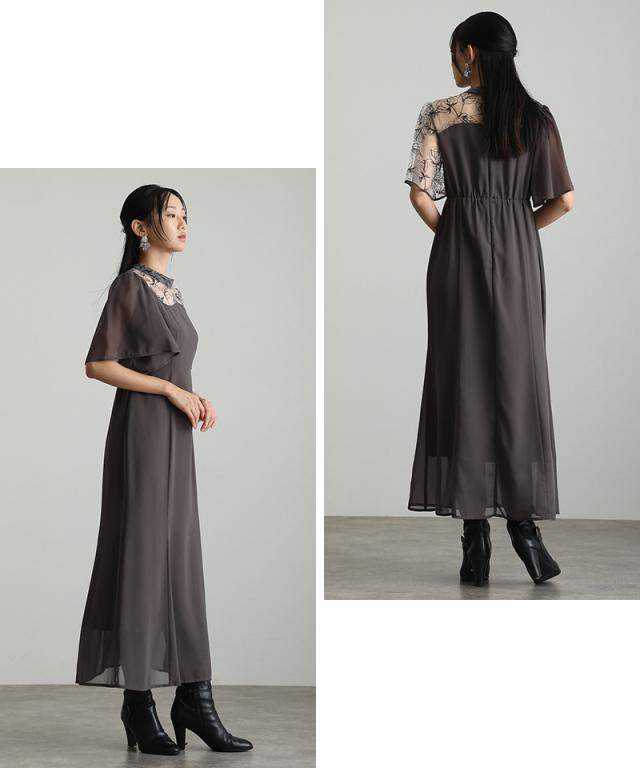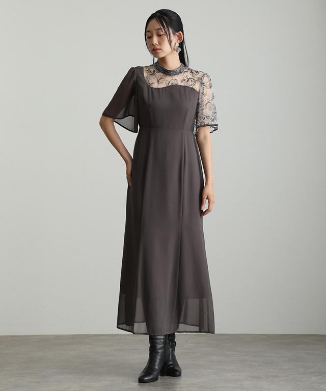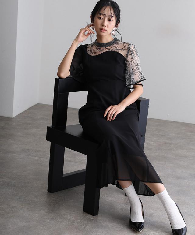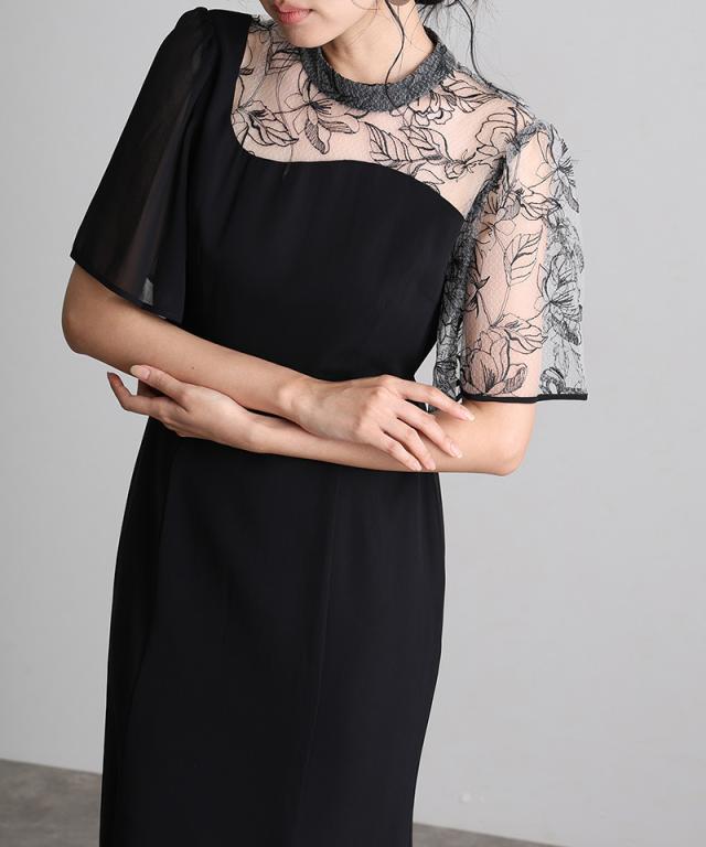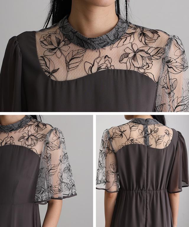 デコルテから腕にかけてのレースの透け感が、上品で華やかな印象に。