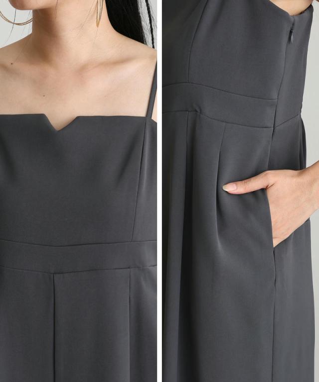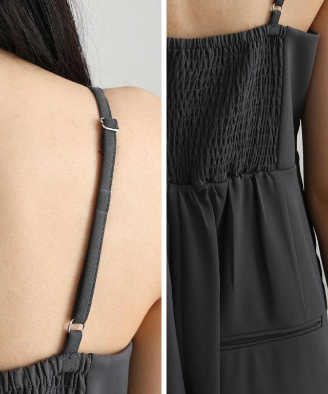 オールインワンのウエスト部分にベルト風の切り替えを施し、体型を選ばずスッキリ見えを実現。