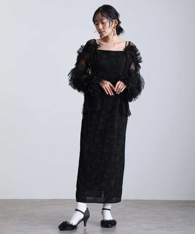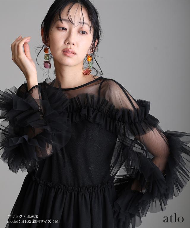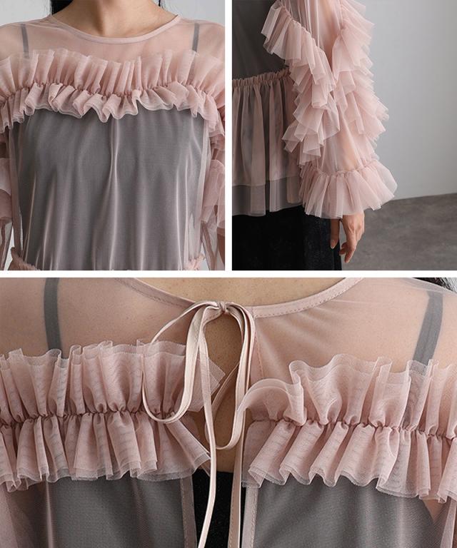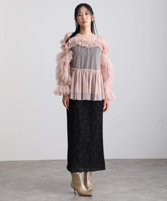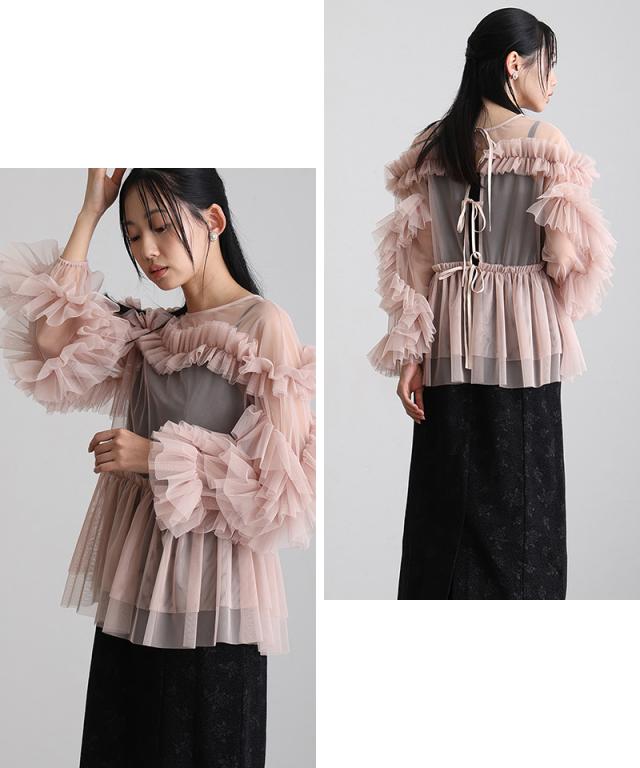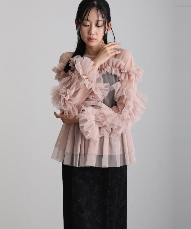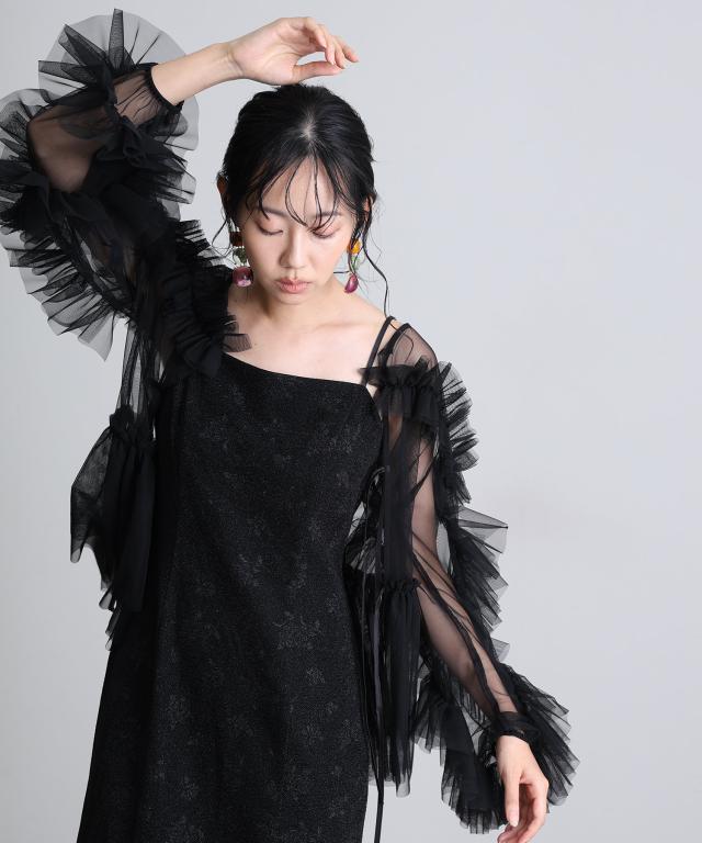 柔らかな透け感チュールに重ねられたフリルが華やかさをプラス