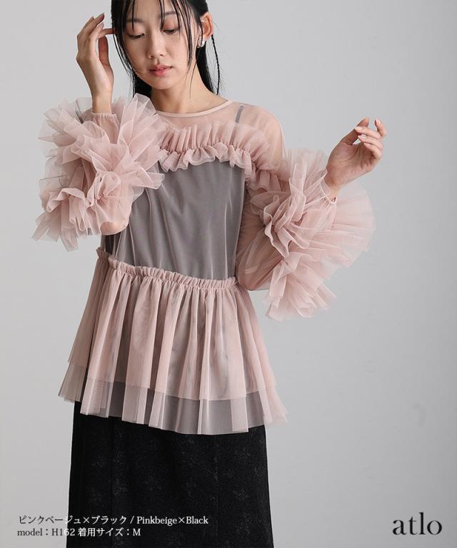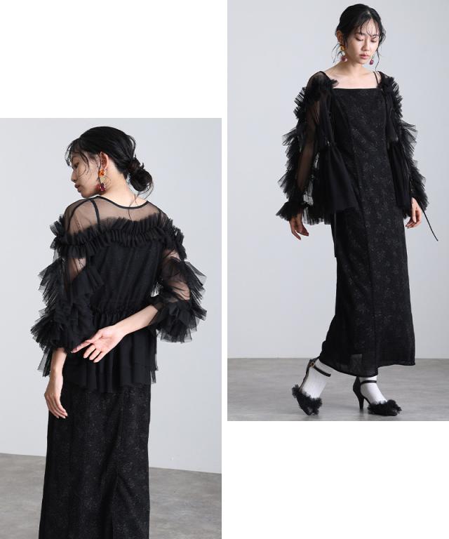 チュールフリルブラウス×シャイニーキャミワンピース【501251920】10代・20代・30代・40代・50代・ドレスワンピ・フォーマルワンピ・パンツドレス・服装・ワンピース・ドレスカジュアル・ブランド・七分袖・長袖・ロング・膝丈・薄手・厚手・無地・刺繍・脚長効果・伸縮性・キレイめ・着やせ・体型カバー・スタイルアップ・レース・リボン・ドレープ・小さいサイズ・3Lや4L・かっこいい・かわいい・即日発送・送料無料・結婚式・婚活・披露宴・顔合わせ・発表会・演奏会・二次会・同窓会・お呼ばれ・食事会・謝恩会・親族・七五三・お宮参り・冠婚葬祭・弔事・女子会・韓国・デート・入学式・卒業式・入園式・卒園式・ママ・ピアノ・マタニティー・セレモニー・セレブ・パーティー