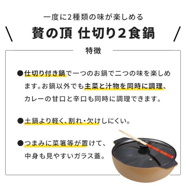 | 仕切り鍋 28cm IH対応 二食鍋 卓上鍋 2色鍋 直火 ガラス蓋付き 両手鍋 鍋 2種類 二色鍋 2食鍋 4〜5人用 欲張り鍋 もつ鍋 キムチ鍋 チゲ鍋 寄せ鍋 おでん鍋 火鍋 石狩鍋 鶏鍋 牡蠣鍋 カニ鍋 冬 カレー しゃぶしゃぶ 新生活 一人暮らし |