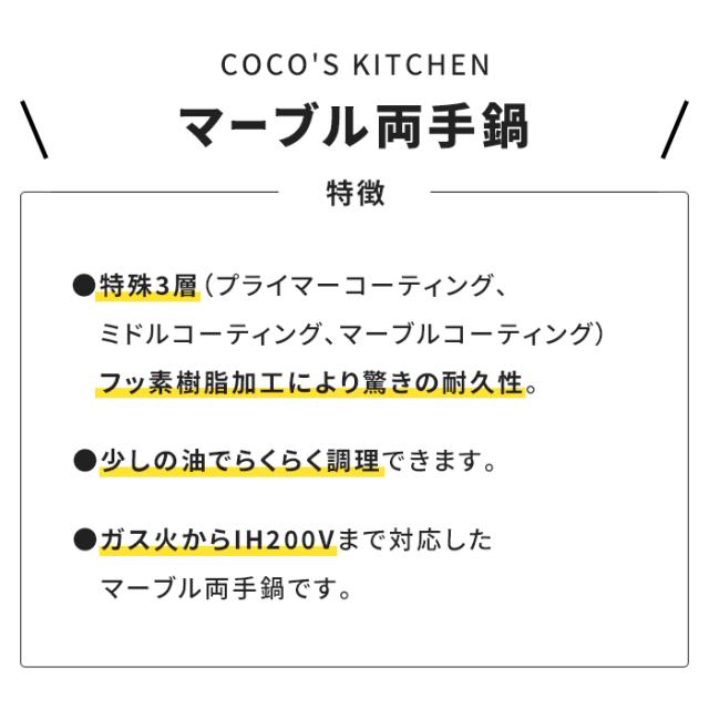 | 【COCO'S KITCHEN ◆ IH対応】 ● マーブルフライパン20cm ● マーブルディープパン24cm ● マーブルフライパン26cm ● マーブルフライパン28cm ● マーブルいため鍋28cm ● マーブル玉子焼13×18cm ● マーブル片手鍋18cm ● マーブル両手鍋20cm ● マーブル蓋付フライパン26cm ● マーブル寸胴鍋22cm ※このページは[COCO'S KITCHEN ◆ IH対応 マーブル両手鍋20cm]を販売しております。 |