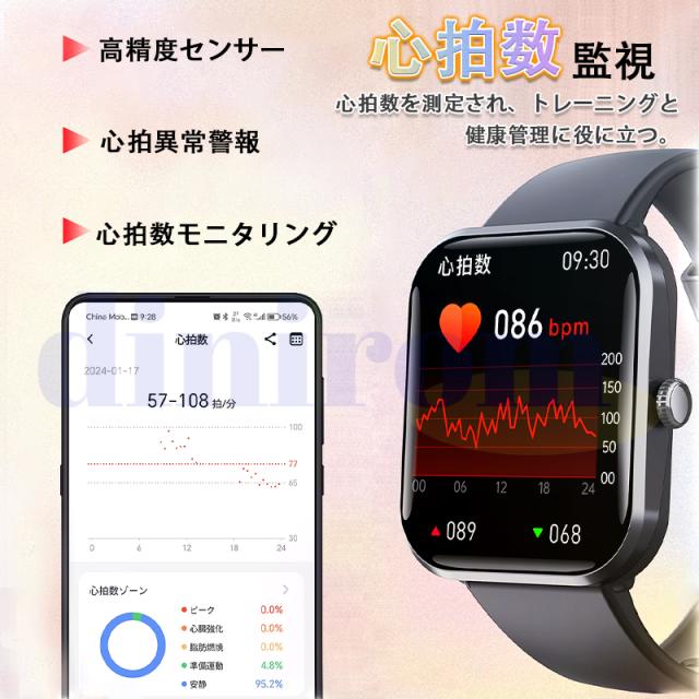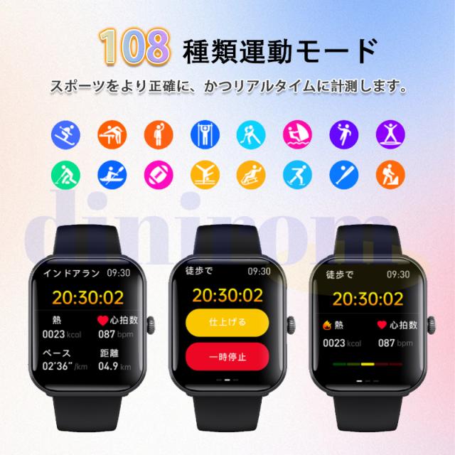 【実用な機能満載&108種類な運動モード】専用アプリに合わせて使えば、このスマートウォッチが持つ様々な便利な生活機能を享受できます。例えば、着信通知/拒否/通話、輝度調整、天気予報、活動量計、歩数計、長座注意、スマートウォッチ探し、目覚まし時計、カメラ制御、音楽制御/再生など実用な機能が備えます。また、スポーツウォッチはウォーキング、ランニング、サイクリング、登山、サッカー、ヨガなど、さまざまなスポーツモードがあります。多種類スポーツ組み込み、消費カロリー、運動データ、歩数計、活動量計、距離などを記録して、運動計画の達成に役に立ちます、自分の状態を十分に把握します。