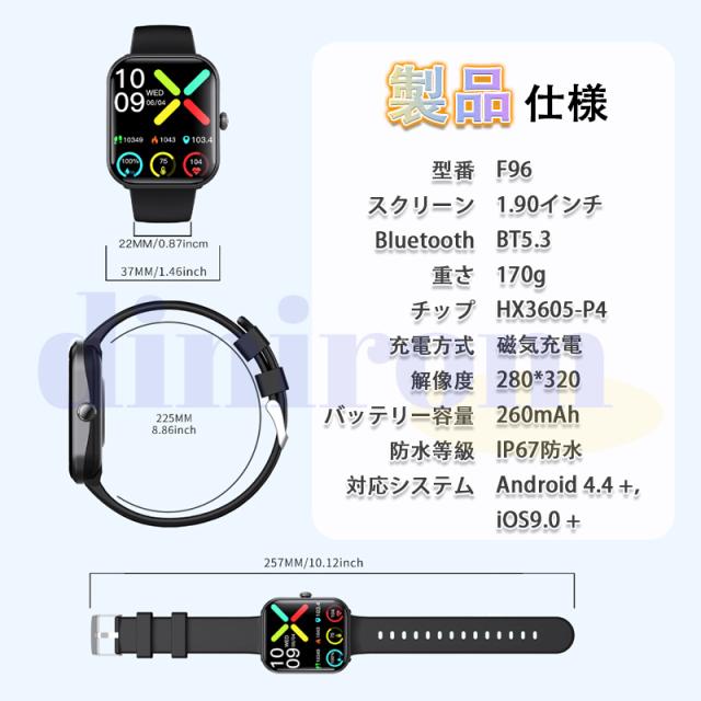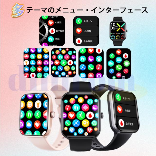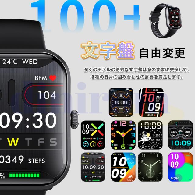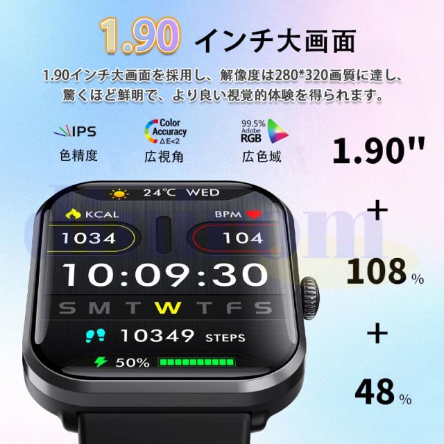 【1.9インチ大画面&文字盤自由設定】1.9インチの大画面と高解像度(280*340)などの要素を組み合わせており、例のない快適な視覚感と優れた操作感をもたらします。更に、文字盤DIY機能もあり、携帯電話中の写真を利用して、お好きな文字盤を作る事もできます。毎日のお気持ちによって、新たな活力を注ぎます。スマートウォッチの言語に英語/韓語など多国の言語を自由に設定できます。付属品:スマートウォッチ 本体×1、充電ケーブル×1、日本語取説書×1。