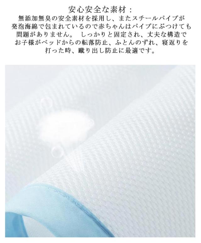| ベッドからの落下を防止:転落防止に役立ち安心してベッドを利用できます。 しっかり固定:マットレスの下に差し込むだけの簡単設置。 釘を打たずにフェンスがきちんと固定できる。子どもがフェンスを押しても倒れない安全性が確保! 片側だけの高さ調整ができる:赤ちゃんを抱きながら、ボタンを押すことで、片手で赤ちゃんをベッドに入れることができる! 大人がベッドへの出入りも便利! 安心安全な素材:無添加無臭の安全素材を採用し、またスチールパイプが発泡海綿で包まれているので赤ちゃんはパイプにぶつけても問題がありません。 しっかりと固定され、丈夫な構造でお子様がベッドからの転落防止、ふとんのずれ、寝返りを打った時、蹴り出し防止に最適です。 | |