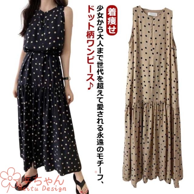 ドット 大きいサイズ ロング丈 ノースリーブ 水玉柄 ワンピース ロングワンピース 水玉ワンピース レディース 無袖 ガーリー ノースリーブ 締め付けなし 楽ちん 送料無料 フレア ゆったり 体型カバー 着痩せ リゾート ワンピ 夏