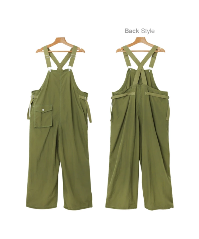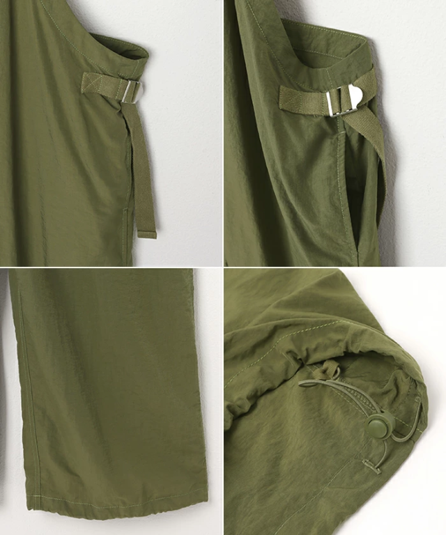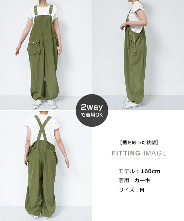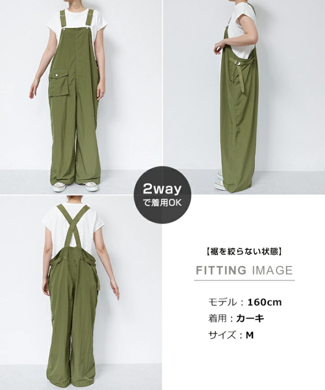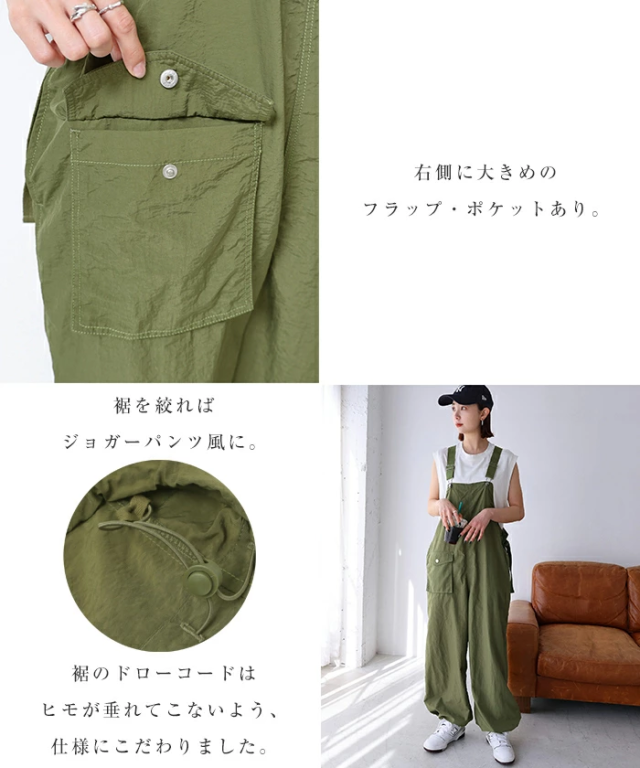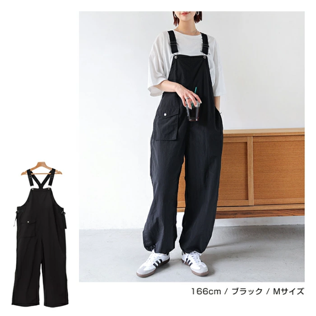 裾のヒモ調節でお好みのシルエットに着こなせる!《2way・ナイロン・サロペット》が新登場しました。表面にシワ感のある、シャカシャカとした質感がトレンド感たっぷりな1枚。サラッと柔らかなナイロン素材は、やや薄手で軽い着用感もポイントです。そのままサラッと着れば、大人っぽい印象のストレート・ワイドシルエット。裾のヒモを絞れば 、ジョガーパンツのようなアクティブで抜け感のあるシルエットに♪フロント部分でストラップ調整可能。さらにウエストコード付きでサイズ調整が可能。利便性のあるサイドポケットと、コーデのポイントになるパッチポケットあり♪裾のドローコードはヒモが垂れてこないよう仕様を工夫しました。