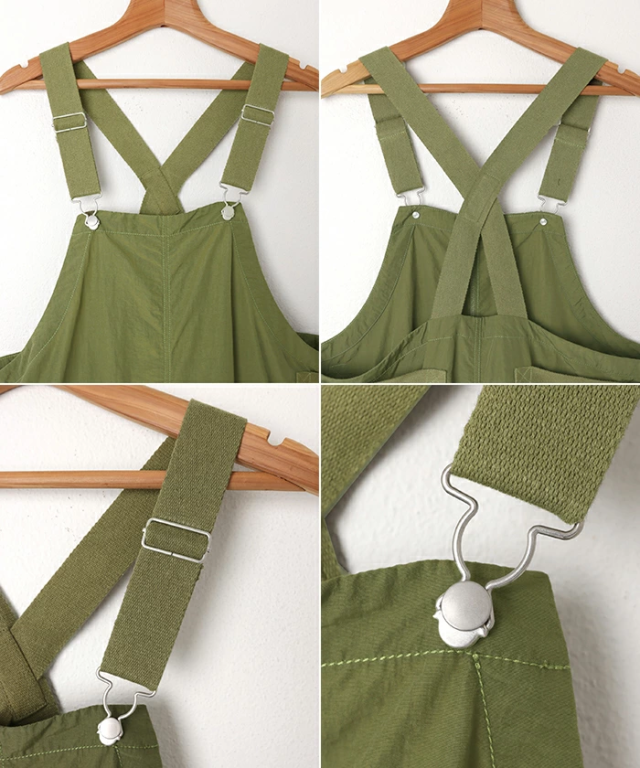 着丈:122cm(肩ひも含めない)、股上:64cm、股下:64cm、裾幅:32cm、わたり:41cm、ヒップ:62cm、肩ひも:(最短)15cm(最長)24cm、重さ:330g