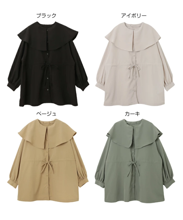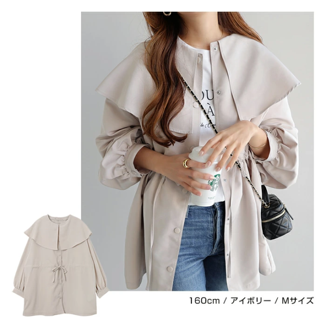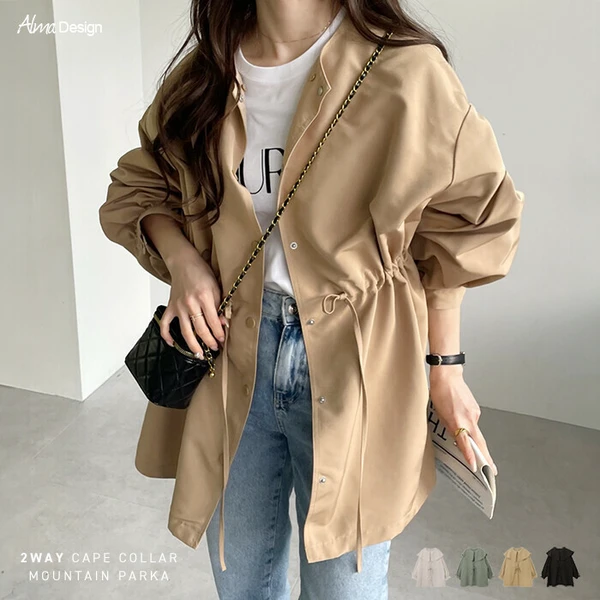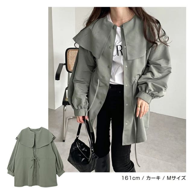 ふんわりとしたケープ風の大きな襟が特徴的な2wayマウンテンパーカーが入荷しました♪ほんのり光沢のあるポリエステル素材で、薄手ながらもハリ感があり、サラッとシャツ感覚で気軽に羽織れる着心地が◎ケープ風の大きな襟はボタン仕様で、取り外すとクルーネックのノーカラーブルゾンとしてシンプルにも着用できる2wayデザイン!ゆるっとしたオーバーサイズシルエット、程よいボリューム感の袖でこなれ感のある印象に。ウエストのドローでシルエットの変化も楽しめて何通りもの着方ができ、コーデの幅が広がります。襟付きで華やかに、ノーカラーでシンプルに。コーデを使い分けて、シーンに合わせたおしゃれが叶う!軽量で持ち運びもしやすいので、気温の変わりやすい時期に体温調節できるライトアウターとしておすすめ