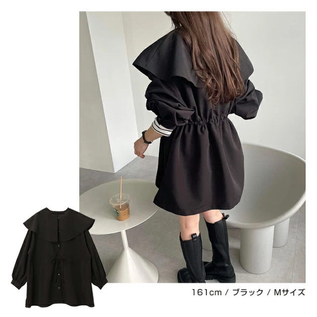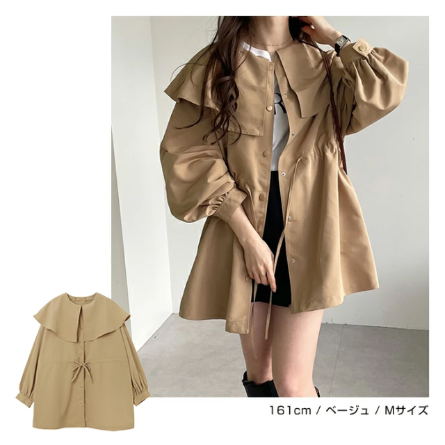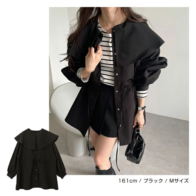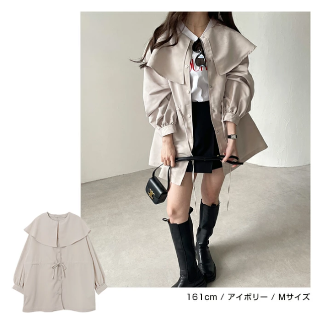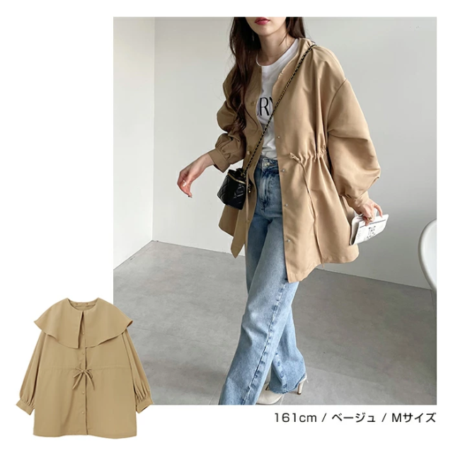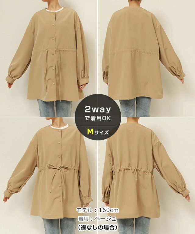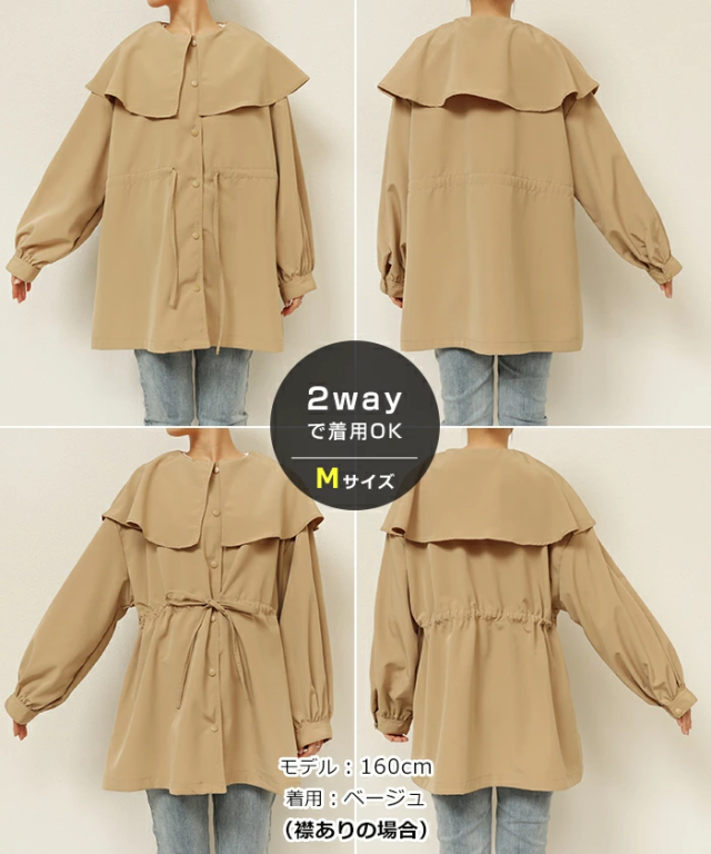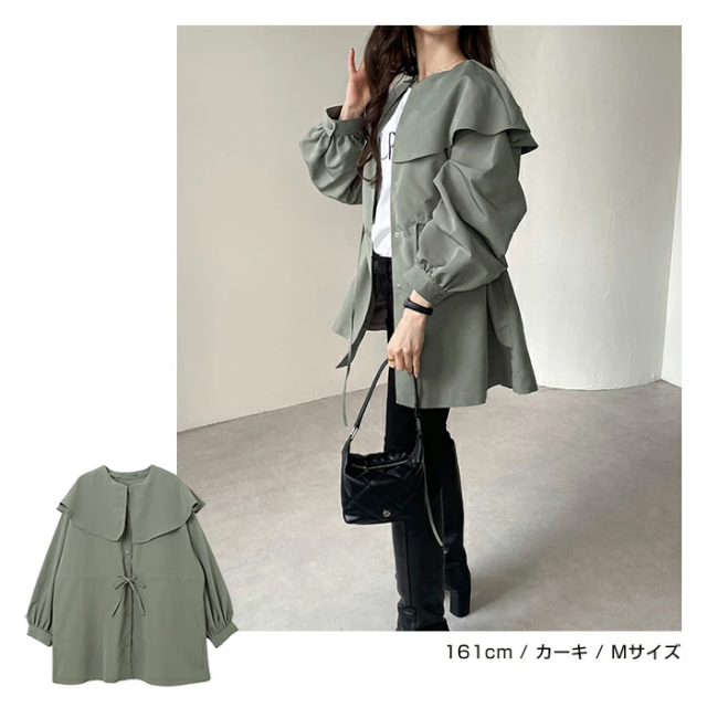 t05 2way ノーカラー マウンテンパーカー レディース ノーカラージャケット アウター ジャンパー 羽織り オーバーサイズ 体型カバー ゆったり 楽ちん 長袖 ポケット ペプラム フレア ケープカラー リボン ミドル丈 きれいめ オフィス カジュアル 秋服 防寒オフィス 春 秋 冬