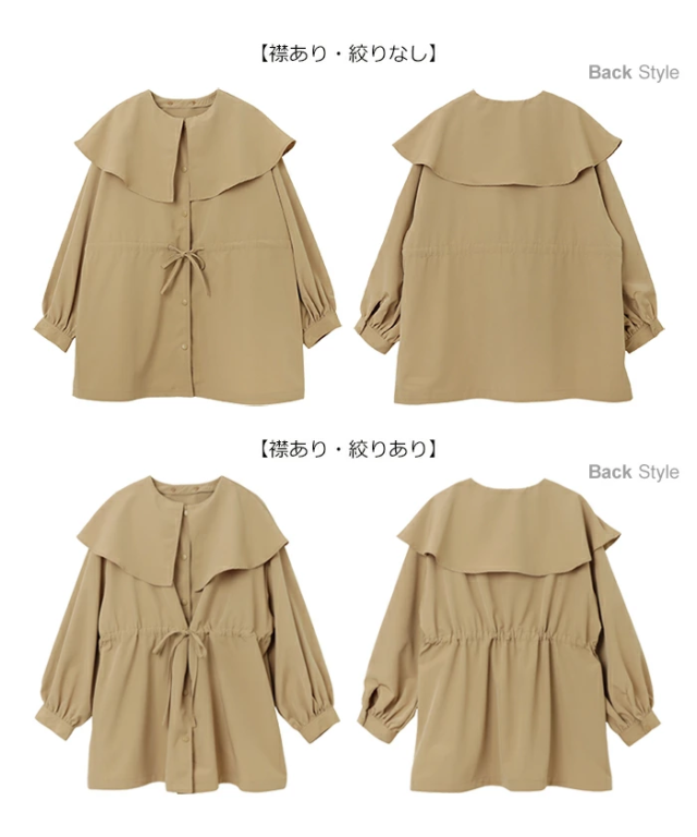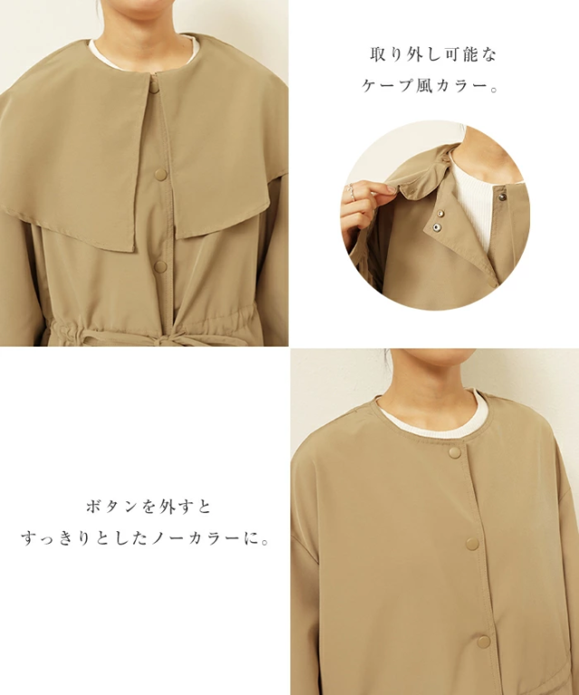 ケープ風の大きな襟はボタン仕様で、取り外すとクルーネックのノーカラーブルゾンとしてシンプルにも着用できる2wayデザイン!