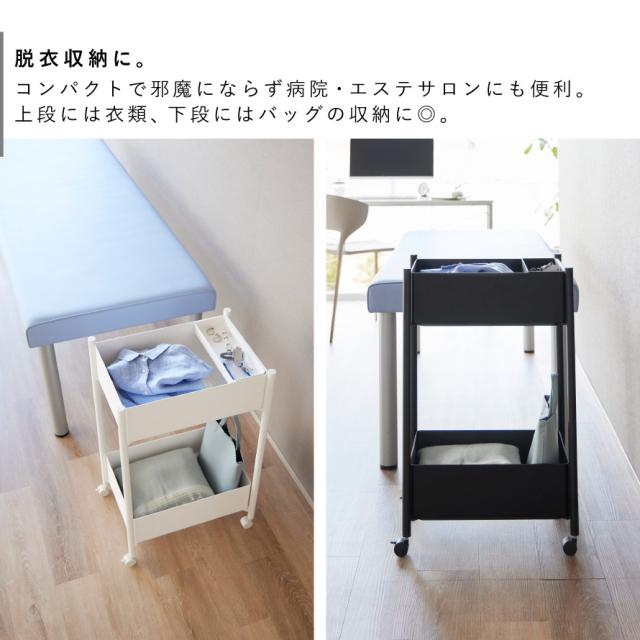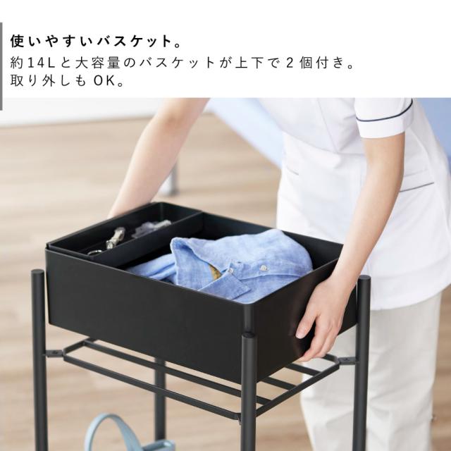 たくさん収納できる2段タイプ。両段に取り外し可能なバスケット付き。バスケットは約14Lの大容量です。クリニックで上段には衣類、下段にはバッグの収納に使用しても。
