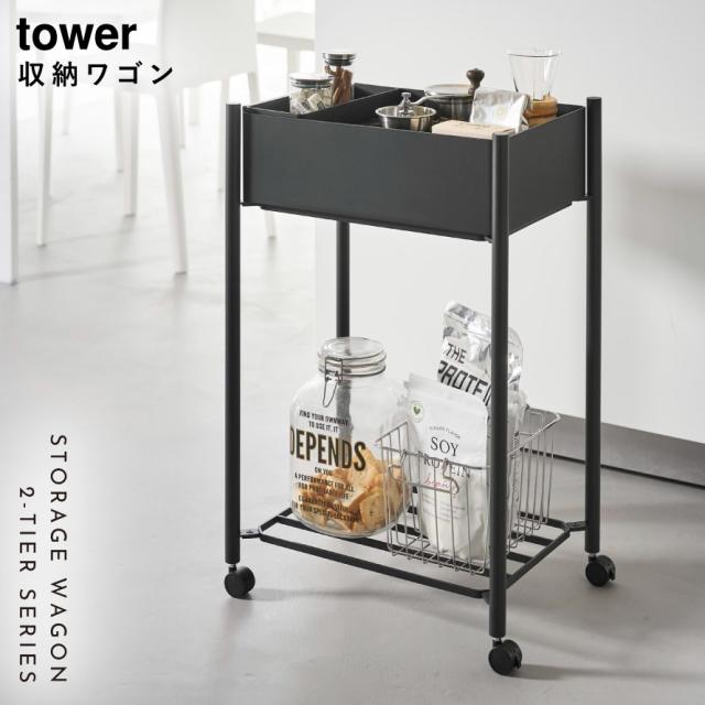 小物トレー付き下段が棚の収納ワゴン 2段 タワー山崎実業 tower ワゴン キャスター付き サロン 2段 スリム おしゃれ モノトーン ホワイト ブラック 10185 10186 メーカー直送