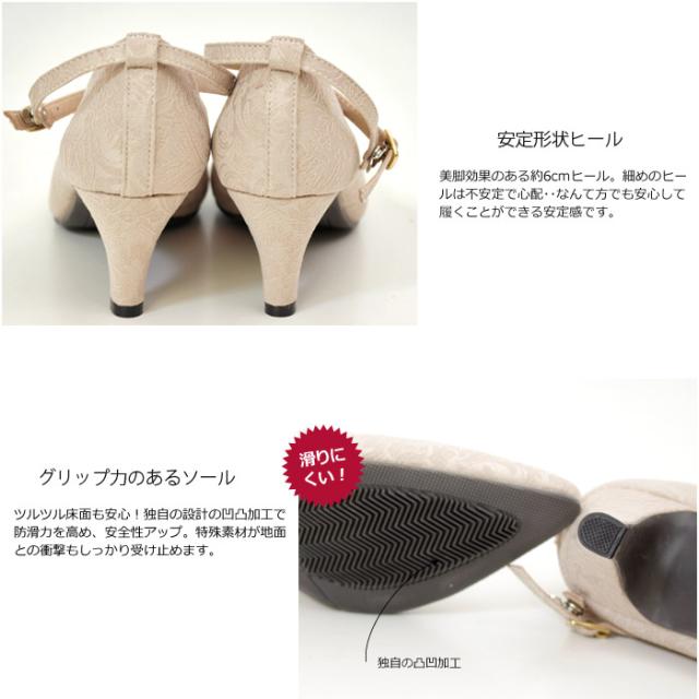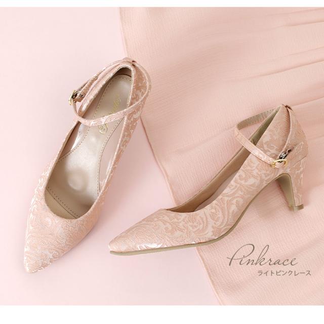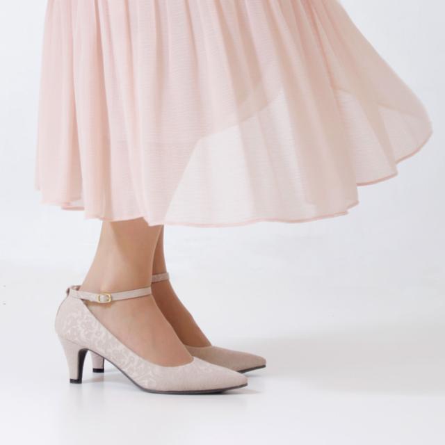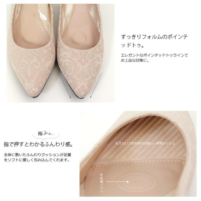 パーティ、オケージョンシーン、日常使いでも幅広くお使いいただけるよう、可愛く、上品な雰囲気に仕上げてみました。クッションが気持ちいい!とリピーターも多い、話題の極ふわクッションを使用した機能性にも自信のあるパンプスです。ドレススタイルと相性の良いレース生地、ドークレ生地の2種類ご用意させていただきました。ストラップは取り外し可能な2way仕様です。