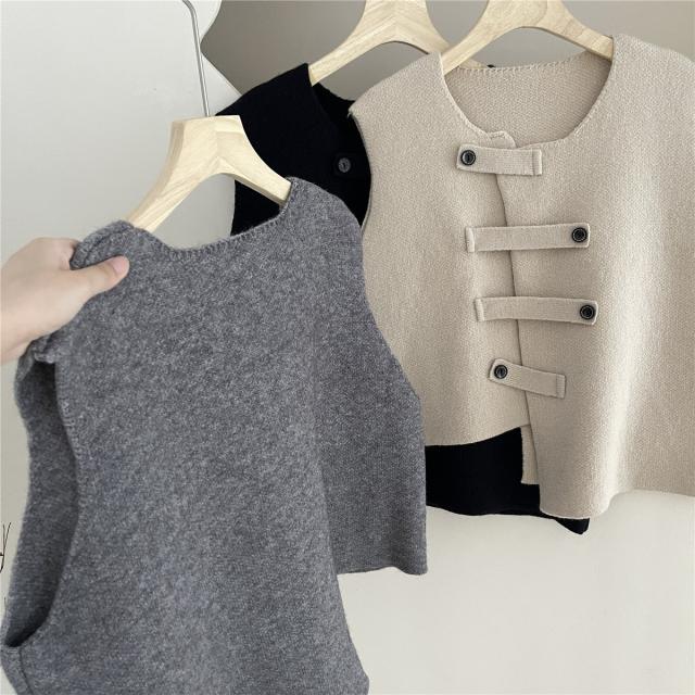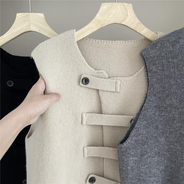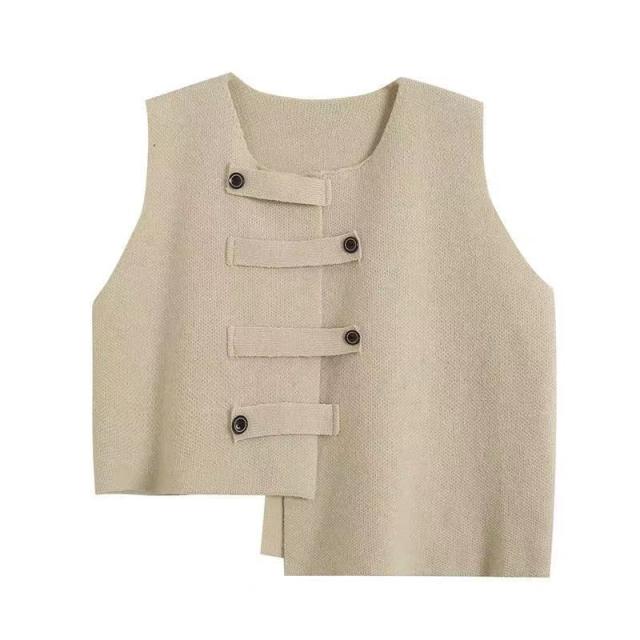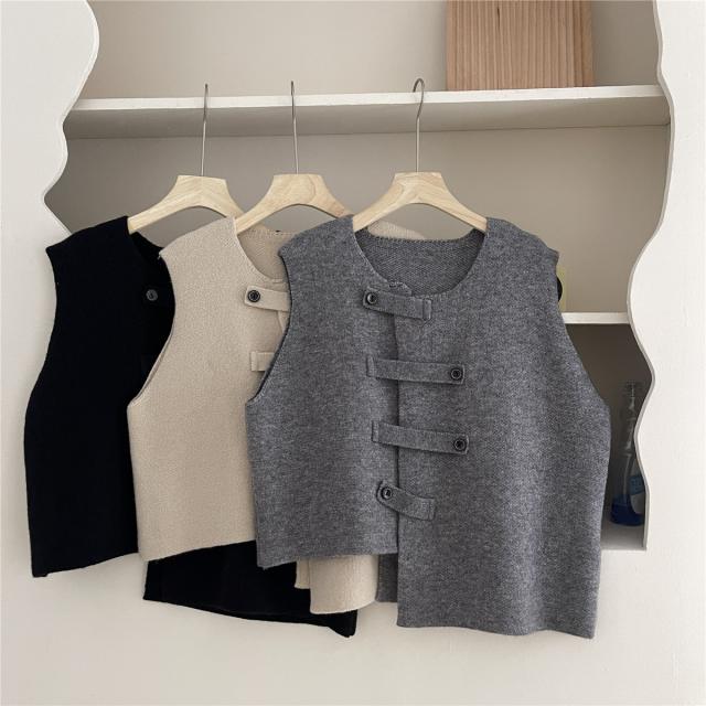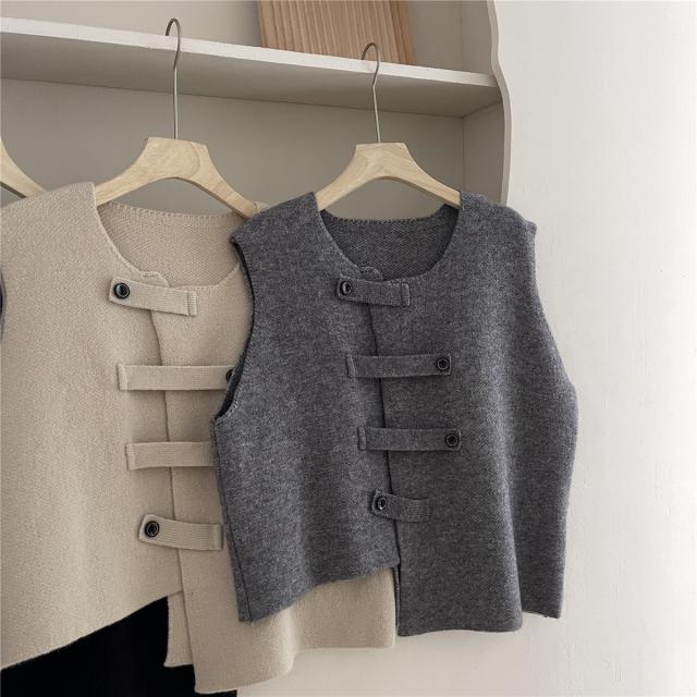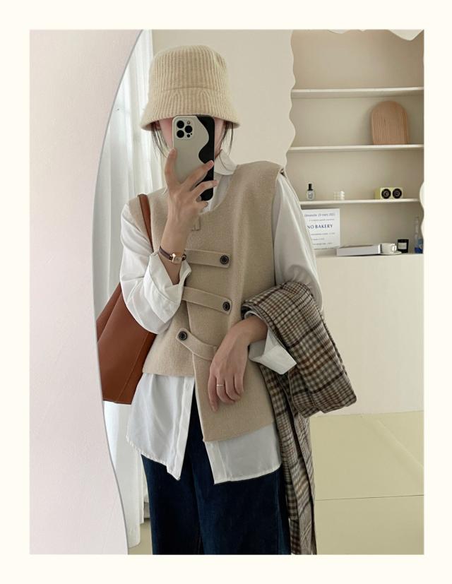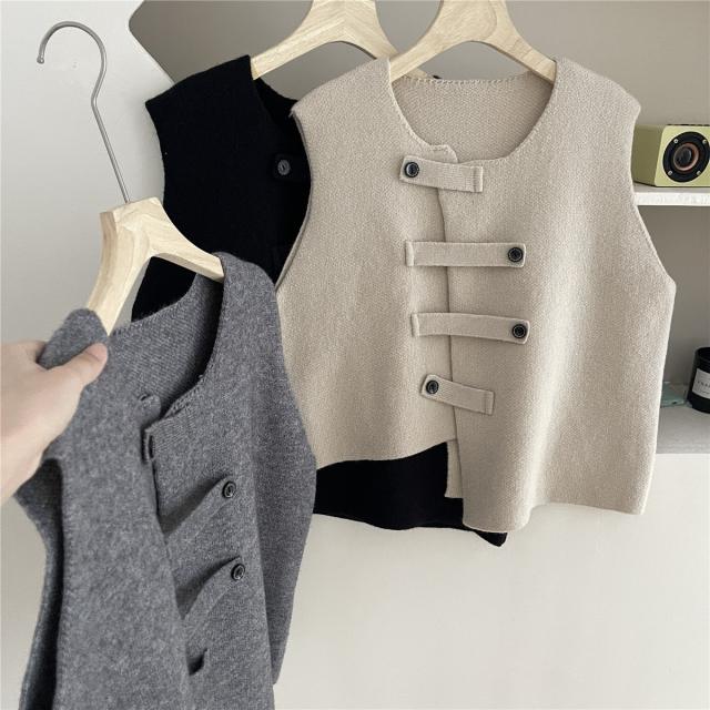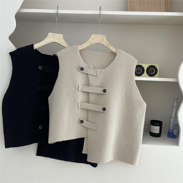アシンメトリー ニットベスト レディース 不規則ヘム ラウンドネック ノースリーブ 前開き ボタン付き レイヤード 秋冬新作