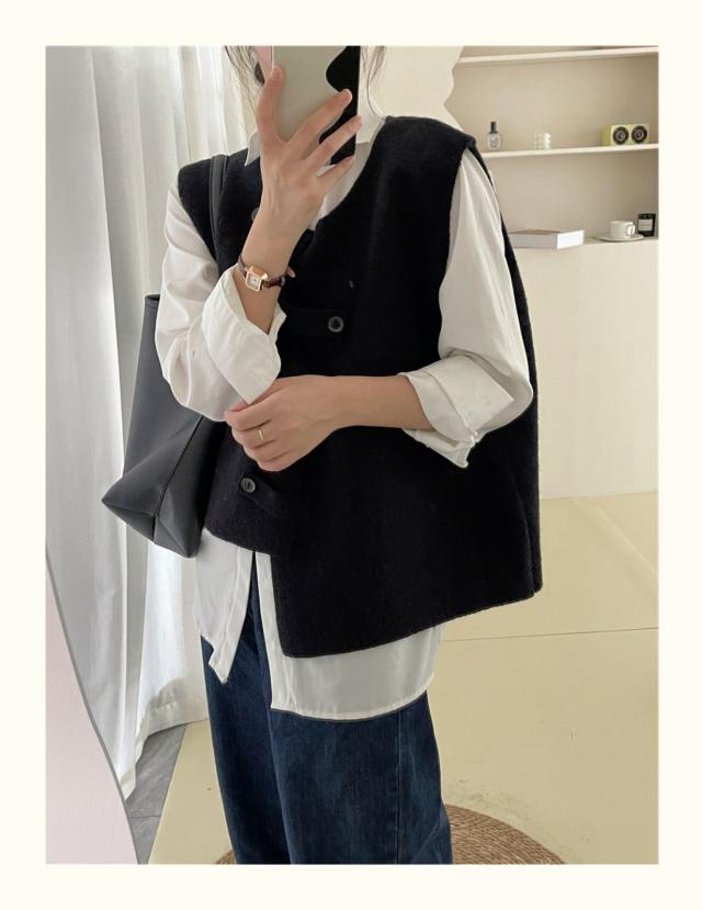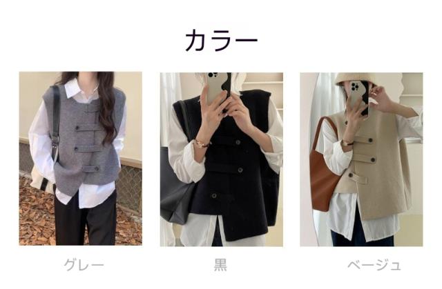 ニットベスト、アシンメトリー、秋冬、重ね着、おしゃれ、ゆったり、前開き、無地、ベージュ、グレー、ブラック