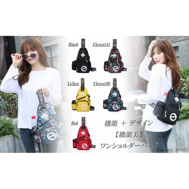 【きれいめデザイン】 ブラック・イエロー・レッド・Flower(A)・Flower(B)の5色展開なので、大人から子供、レディース・メンズとTPOに合わせて自由に選ぶことができるボディーバッグです。