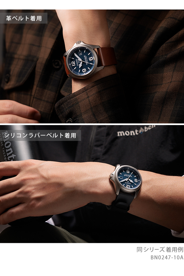 正規品 7年保証キャンペーン 送料無料 シチズン プロマスター LANDシリーズ mont-bell チタン 数量限定 替えベルト ソーラー 光発電エコドライブ 光発電エコ・ドライブ メンズ 腕時計 BN0247-01L CITIZEN PROMASTER アナログ ネイビー ブラウン ◆機能性、耐久性、安全性を兼ね備えた本格スポーツウオッチ、シチズン PROMASTER(プロマスター)。2016年から続くモンベル×シチズンのコラボレーションモデル第5弾。大自然の中で活動する人達がどんな状況でも快適に行動できるよう“Light & Fast” “Function is Beauty”を体現するモンベルの哲学とシチズンの技術が融合。時計としてのミニマルな魅力を究極に引き出しています。ダイバーズウオッチ用に開発されたCal.E168を搭載。アウトドアのハードな環境にも耐え抜くタフさ、昼夜問わない時刻の見やすさ、操作の簡単さといった、優れた実用性を備える1本です。革バンドモデルは、シリコンラバーバンド付属の2Way仕様。ご自身でシーンに合わせて交換できるインターチェンジャブル構造です。裏ぶたレス構造のケースバックには、モンベルのブランドロゴをレーザー刻印。CITIZEN×montbellのロゴが入った専用ボックス付きです。 発売日:2025年10月発売