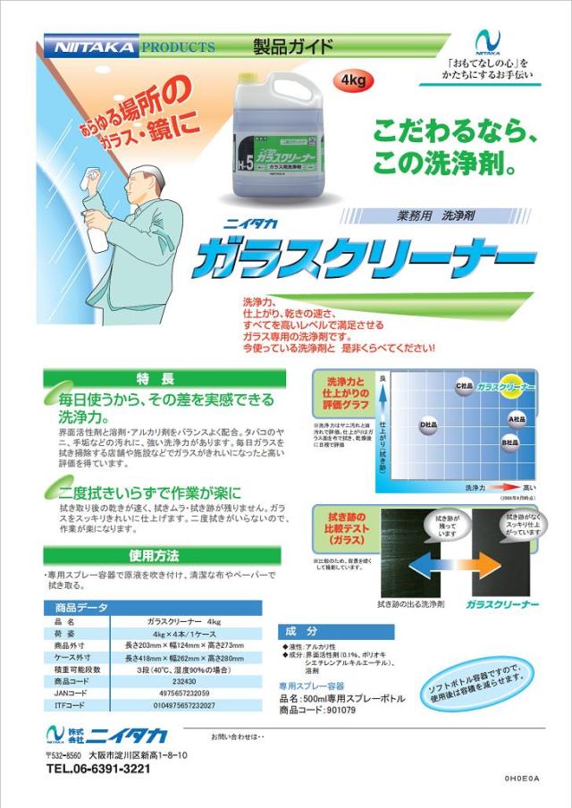 ●洗浄力、仕上がり、乾きの速さ、すべてを高いレベルで満足させるガラス専用の洗浄剤です。