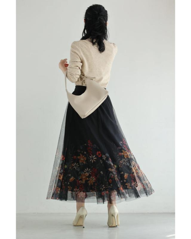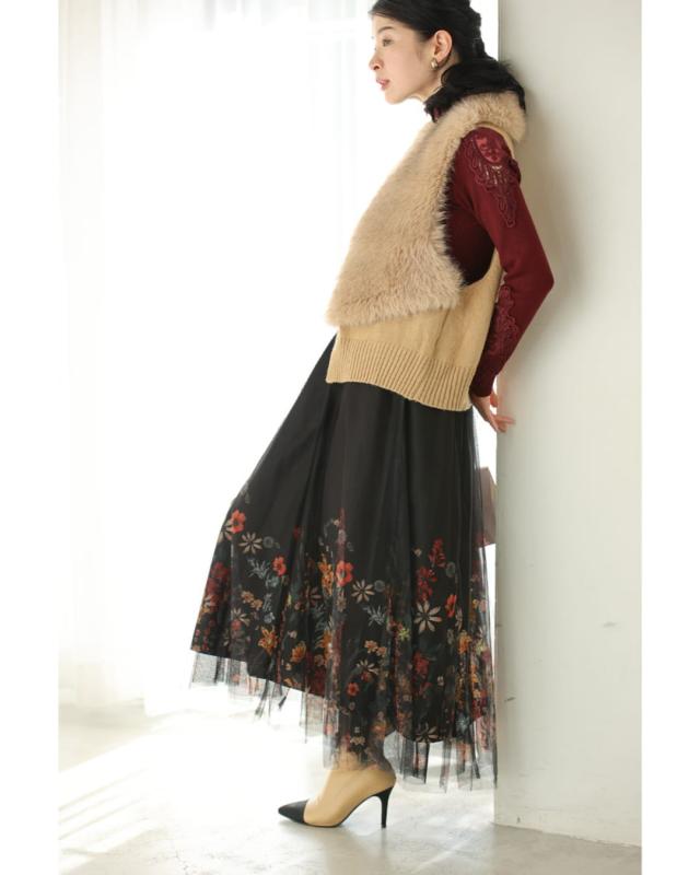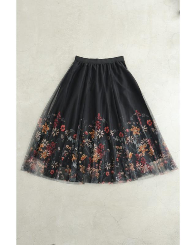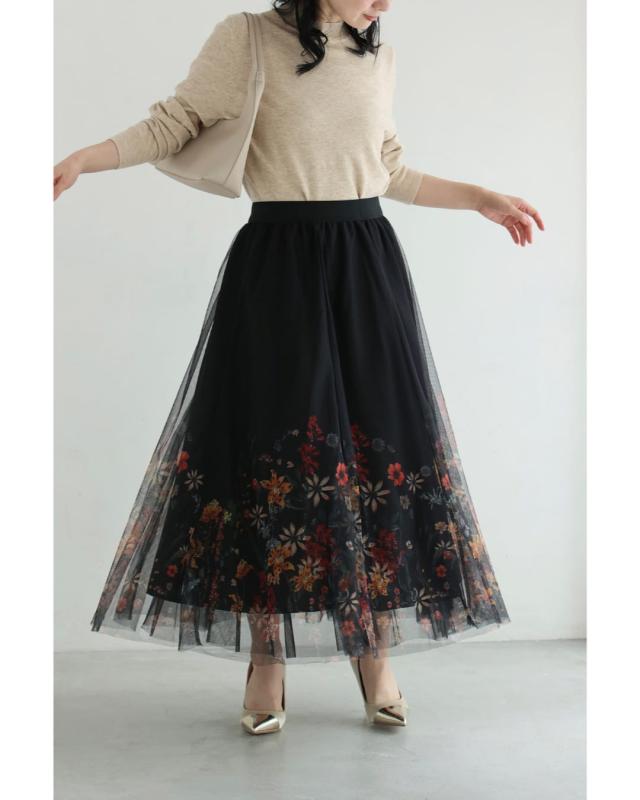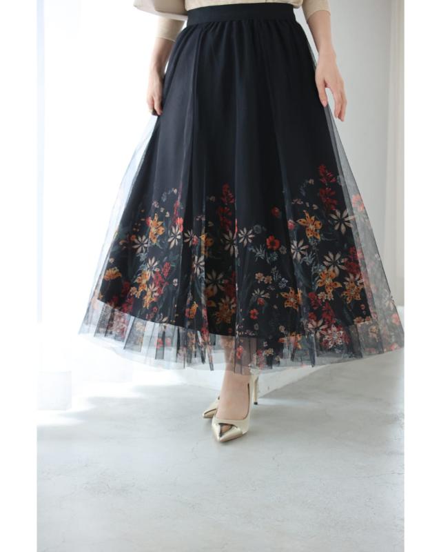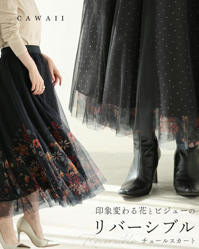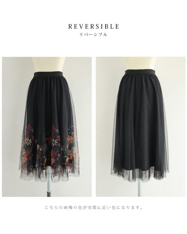 再入荷12月10日 (黒)印象変わる花とビジューのリバーシブルチュールスカート cawaii w61555ps S~2L対応 総ゴム ふんわり 花柄 ブラック オシャレ 個性的 大人可愛い エレガント 上品 春 秋 冬 レディース ファッション ミセス 30代 40代 50代