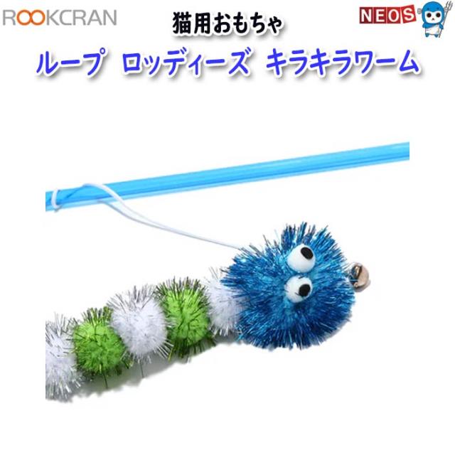 「ロッディーズ キラキラワーム」は、キラキラのモール付きポンポンでできたムシ型のおもちゃがゴム紐で繋った猫じゃらしです。持ち手部分は、クリアカラーの筒状のロッド(棒)になっています。頭部近くには鈴、尻尾には毛足の長い生地を使っているので、音でも動きでも猫ちゃんを引きつけることができます。