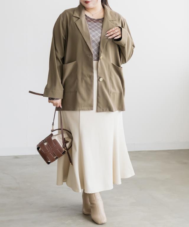 | 3Lサイズを着用して、ちょうどいいサイズ感でした♪ お尻が隠れるくらいの丈感で、さっと羽織るだけでこなれた雰囲気に◎ 軽やかな生地感で、長時間着てもストレスフリーな着心地でした! シャツ感覚で着られるジャケットです!ゴールドボタンのデザインが上品で、カジュアルにもきれいめにも合わせやすいのが嬉しいポイント♪ デニムと合わせてラフに着こなすのはもちろん、スラックスやスカートと合わせてオフィスカジュアルにもぴったりな万能ジャケットです◎ |